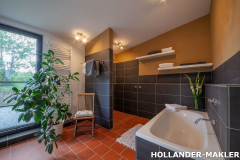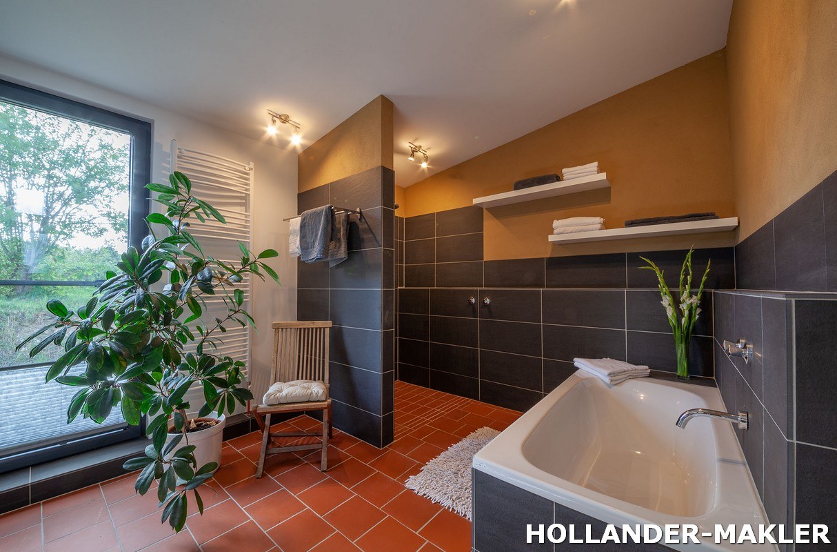 – Badkamer met bad, douche, toilet, urinoir en dubbele wastafel