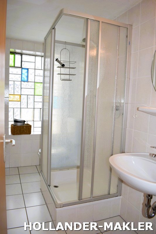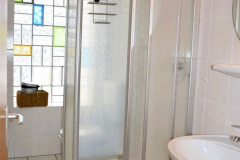 • Badkamer met douche, bad, toilet en wastafel.